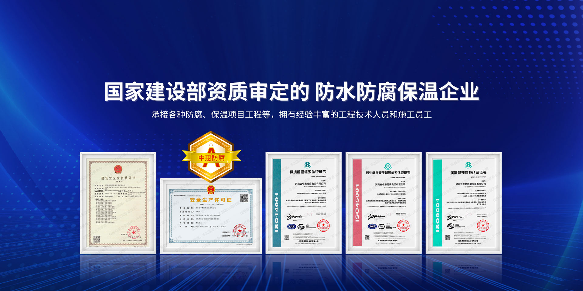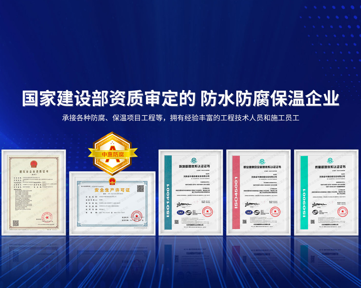 公司經營范圍:防水防腐保溫工程;消防設施工程;建筑裝修裝飾工程;建筑機電安裝工程;電力工程;建筑工程;石油化工工程;工業清洗工程;油罐清洗工程;鋼結構工程;環保工程;模板腳手架工程;電纜防火封堵、防污閃噴涂、外墻外保溫工程;各類施工勞務作業;設備維修、船舶鉚焊、涂裝;電力工程材料、建材、防水材料、防火材料、防腐保溫材料銷售,并相繼通過了GB/T19001-2008idtISO9001:2008GB/T50430-2007質量管理體系認證證書。GB/T24001-2004idtISO14001:2004環境管理體系認證證書。GB/T28001-2011idtOHSAS18001:2007職業健康安全管理體系認證證書。公司是中國防腐蝕于防護協會、中國施工企業管理協會、電力協會和中國鋼結構防水協會會員單位。 公司的經營業務涵蓋了石油、化工、電力、冶金、煤炭、船舶、國防、燃氣、水利、環保、交通運輸、航空及國防軍工和輕紡市政等行業的防腐保溫絕熱設備。鋼結構安裝、防火、防水、金屬噴鍍、聚脲噴繪、陰極保護、防滲透堵漏、玻璃鋼及各種磚版材料襯里、橡膠襯里、煙氣硫和耐酸溶劑腐蝕等工程施工。公司連續十年榮獲“省市先進施工企業”“安全生產先進單位”“重合同,守信用企業”和“AA***資質企業”的稱號。2000年被命名為市級文明單位,2002年被國家工商行政管理局命名為“重合同,守信用的企業”、被中國工業防腐蝕技術協會命名為“防腐蝕企業,能源節約及環境保護領域有豐富的經驗和***的業績。工程一次交驗合格率100%。其中攀枝花鋼鐵公司煉鐵廠四號高爐及熱風爐防腐工程、上海寶鋼公司煤氣柜防腐工程、撫順石油一廠裝置防腐項目、齊魯石化公司稀烴廠高塔防腐工程、吉林化學工業公司煉油廠油罐防腐工程、天津石化熱電廠六號爐頂棚聯絡管保溫工程、大慶油田(太倉)力神泵業工程、中國化學工程第十一建設工程、中原油田勘探局工程、中國石化銷售有限公司華北分部、魯皖輸油管道工程、貴州開磷息烽合成氨工程、陜西黃陵煤化工程、中國石油天然氣西部管道塔里木輸油工程、邯鋼集團邯寶鋼鐵公司煉鐵工程、德州供電工程、吉寶(南通)船廠工程,偃師華潤熱力工程、鄭州熱力總公司。 河南省中惠防腐安裝有限公司愿以豐富的施工經驗,***的技術,***的設備,***的管理,***的服務,竭誠為國內外廣大的用戶提供***滿意、******的工程作品。 我公司愿與國內外同仁一道,團結協作,共同推進防腐蝕行業發展! 公司地址:河南省長垣縣建設路北段360號 固定電話:0373-8866488 郵編:453400 網址:http://www_zhff_com_cn.urtra.com